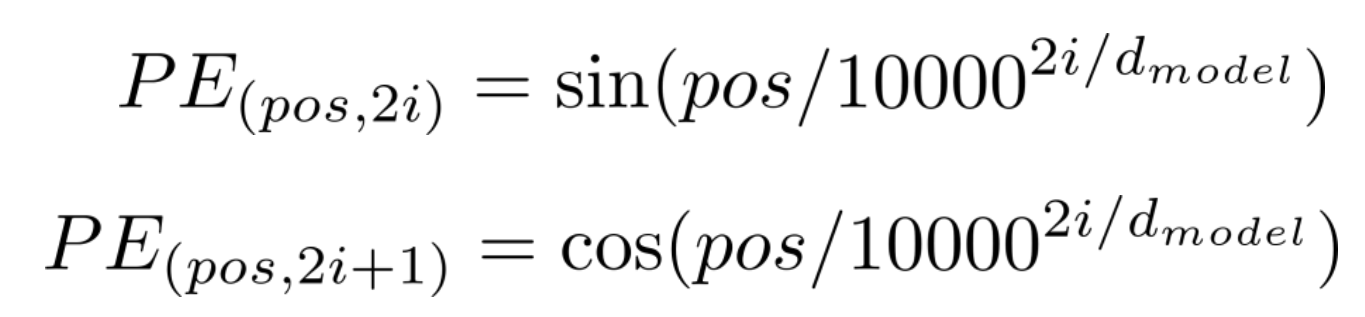 이 두 특징을 만족하는 Position Encoding을 위해, Transformer 논문에서는 아래와 같은 수식을 기반으로 계산하게 된다.