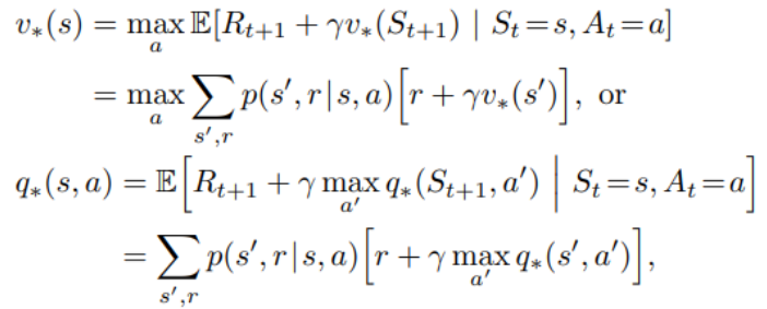 $$ v_*(s) = \underset{\pi}{max} v_{\pi}(s) \qquad \qquad q_*(s,a) = \underset{\pi}{max} q_*(s,a) $$