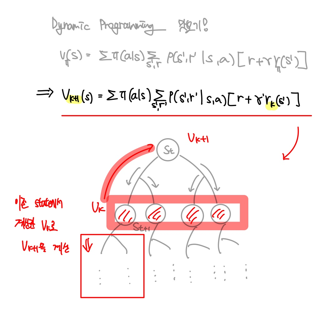 state-value function은 주어진 policy에 다라서 State $s$를 선택했을 때, 다음 State로 가능한 $s'$과 그때의 $r$에 대하여, $r$과 discount factor가 곱해진 $s'$에서의 state-value function으로 정의된다.