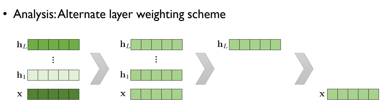 또한, 앞서 언급한 Weight를 부여하는 방법 역시 Task-specific 하게 Layer에 따라 서로 다른 가중치를 부여하는 것이 가장 효과적이라고 한다. 이는 각 Layer에 따라서 학습되는 목적이 다르기 때문인데, 상위 Layer에서는 문맥과 관련된 추상적인 의미가 학습되고, 하위 Layer에서는 문법적인 특징과 관련된 의미가 학습된다. 따라서 Task에 따라 각 Layer의 Hidden Vector에 대한 가중치를 조절해서 다양한 Downstream Task에 효과적으로 적용시킬 수 있다.