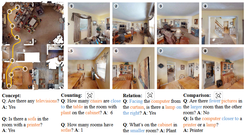 이 과정에서, 5k개의 장면과 장면에 대한 50k개의 질의응답쌍(Question-Answering Paris)로 구성된 3DMV-VQA(3D Multi-view Visual Question Answering)을 제공한다. 3DMV-VQA는 Habitat-Matterport 환경에서 Agent가 직접 돌아다니면서 환경을 탐색하고 다양한 View에서 이미지를 촬영하면서 생성하게 된다. 또한, 객체의 GT Location, Segmentations, Semantic Information 그리고 그들간의 관계를 포함하는 Scene Graph Annotation을 HM3DSem을 통해 취득한다. 이를 바탕으로, 3D Resoning을 평가하기 위한 concept, counting, relation 그리고 comparison을 포함하는 3D-related 질문 유형을 설계한다.