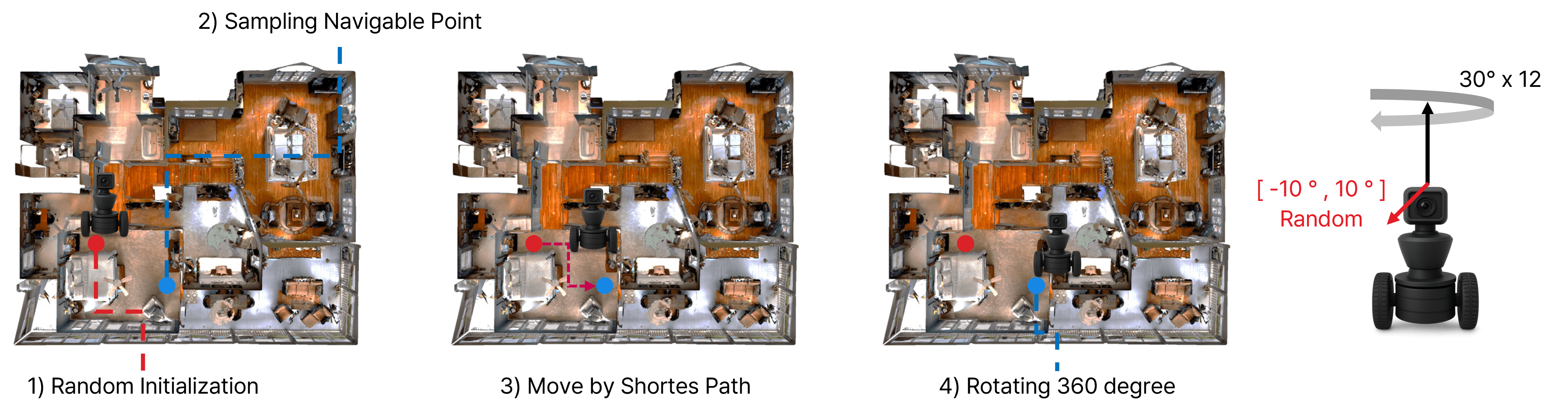 각 Scene에 대해서 RGB Sensor를 가진 Robot Agent은 랜덤하게 초기 위치에 위치하게 된다. 이후 탐색할 수 있는 포인트를 생성하고, 해당 포인트로 이동하는 최단경로로 이동하게 된다. 이 과정에서 Agent는 이미지를 취득한다. 해당 포인트에 도착한 Agent는 도착 포인트에서 30도씩 12번 z축으로 회전하면서 이미지를 취득한다. 이때, Random하게 -10도~10도 범위 내에서 x축 방향으로 고개를 움직이게 된다. 이 과정에서 360의 3D view를 관측할 수 있다. 이때, 카메라가 객체로부터 너무 가깝거나 멀어서 Agent가 객체를 볼 수 없는 경우, Bad-view Image로 간주하고 버리는 정책을 취하게 된다.