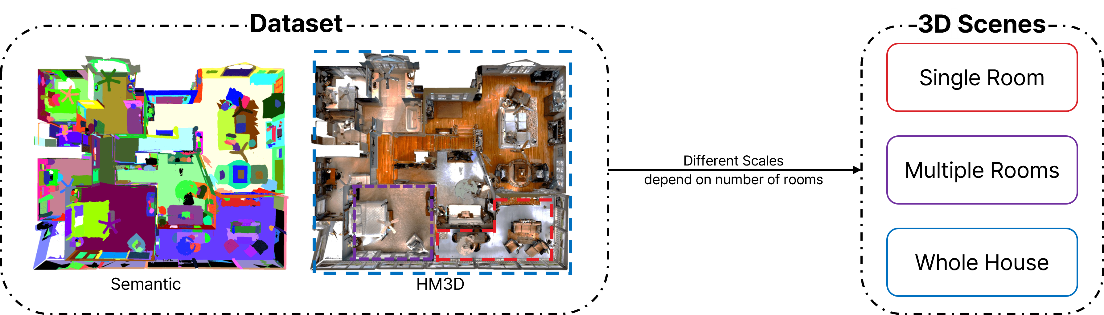 서로 다른 레벨의 질문을 포함하는 Benchmark를 구성하기 위해 서로 다른 규모의 3D Scene을 포함하는 데이터셋을 구축하였다. 가장 기본적인 질문들을 위해서 1개의 방을 포함하는 HM3D Scenes로 부터 시작하게 된다. 이후, 각 방과 인접한 여러개의 방을 포함하는 Multiple Rooms, 최종적으로 모든 방을 포함하는 집 전체(Whole House)로 구성하게 된다. 각각의 규모는 방의 크기(Bounding Box)로 정의되며, 최종적으로 3DMV-VQA Benchmark는 2,000개의 Single-room, 2,000개의 Multi-room, 100개의 Whole-house scenes로 구성된다.