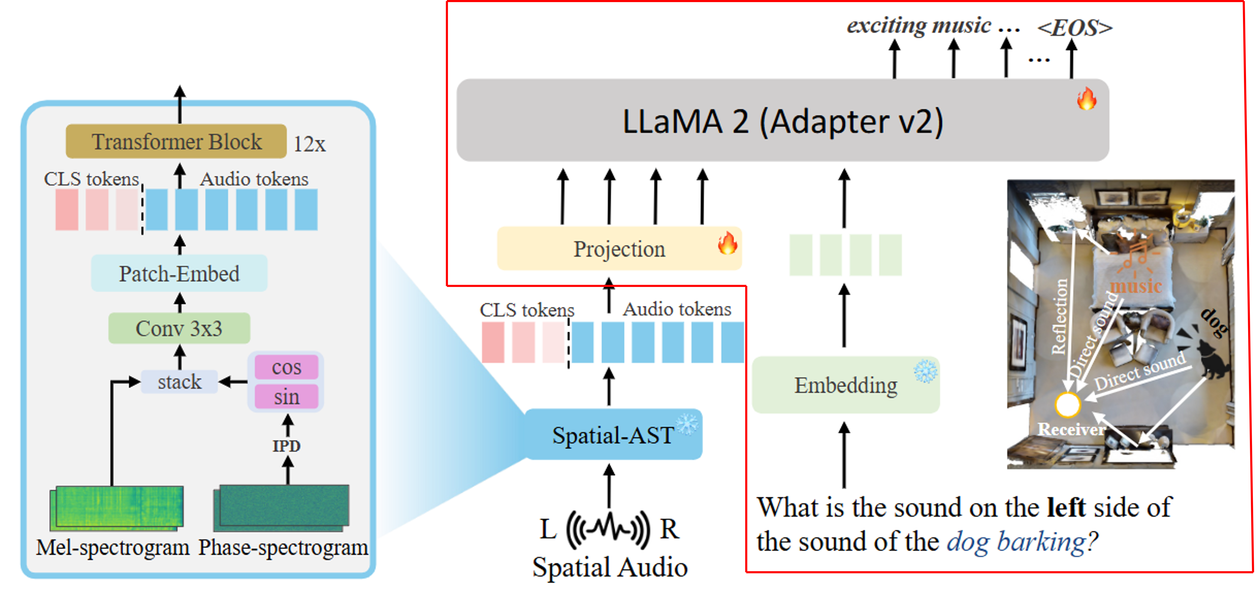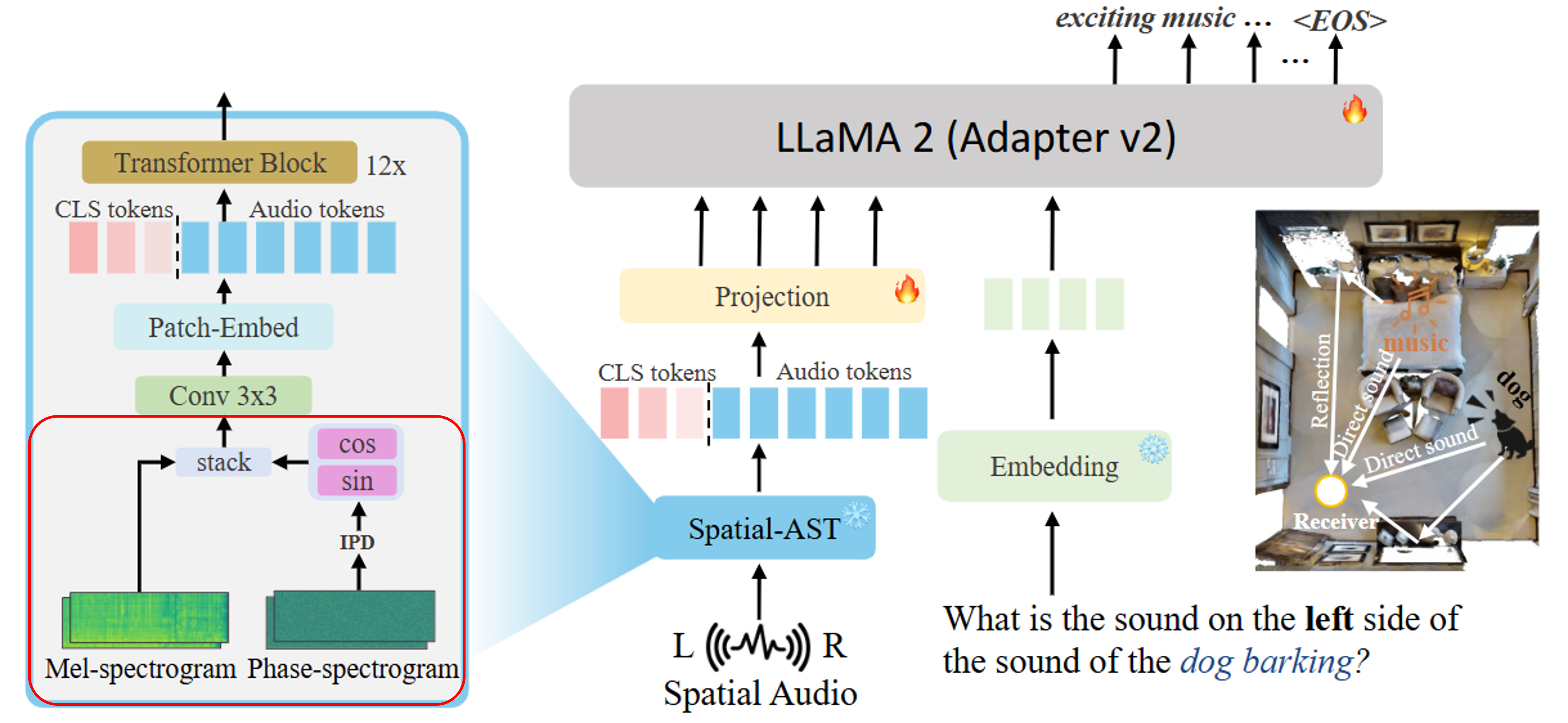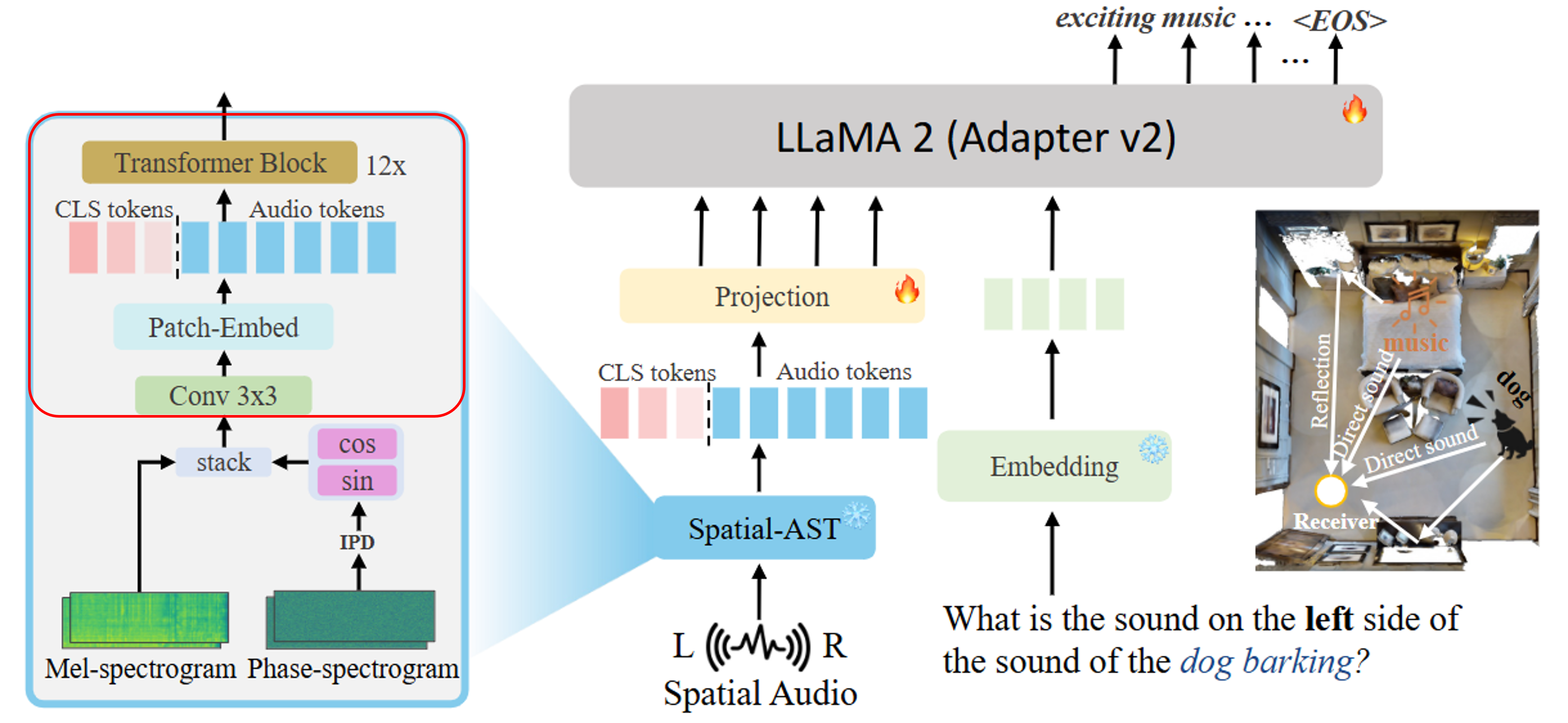 하나의 환경에서 다중 음원에 대한 공간적 추론 능력을 부여하기 위해, SPATIAL-AST와 LLaMA-2 7B LLM을 융합한다. Projection Module에 의해 Spatial-AST의 Output Tokens는 LLaMA-2의 Input Text EMbedding Space로 Mapping 된다.