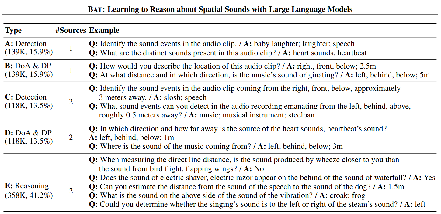 BAT는 Model의 Task를 Table 2와 같이 단계적으로 구성하였다. $A, B$는 단일 음원 인식, $C, D$는 다중 음원 인식, $E$는 추론 Task를 통합한 것으로, 다중 음원에 대한 공간적 관계를 추론하는 Task이다.