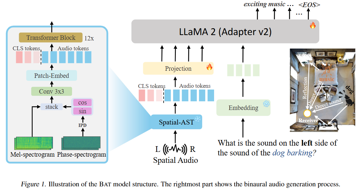 본 논문에서 제안하는 BAT는 Figure 1과 같다. BAT의 Front-End인 Spatial-AST가 Audio Encoder로써 동작하고, Spatial-AST의 Output을 LLaMa 2에서 Text Embedding과 통합하여 Spatial Reasoning Ability를 구축하는 구조이다.