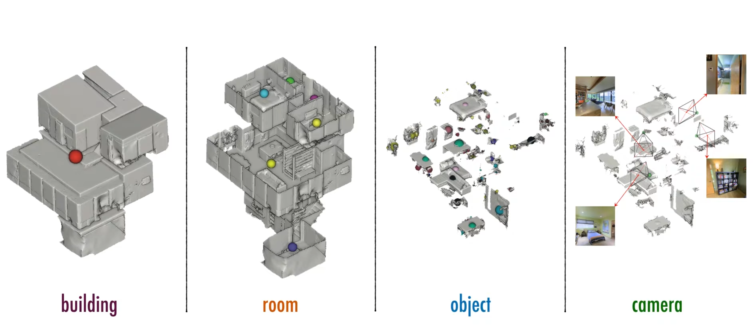3D Scene Graph는 4계층(4 Layer) 그래프이며, 각 Layer는 노드(Node) 집합으로 구성, 각 노드는 속성(Attribute) 집합을 가지며, 노드간의 관계는 엣지(Edge)로 정의된다. First Layer는 전체 건물 즉, 주어진 3D mesho model을 의미하며, 이를 대표하는 root node를 포함한다. Second Layer는 건물을 구성하는 방으로 구성되며, 각 방은 고유한 노드로 표현된다. Third Layer는 각 방에 속하는 객체들로 구성되며, 각 객체는 고유한 노드로 표현된다. Fourth Layer는 카메라들의 집합이며, 각 카메라의 위치가 고유한 노드로 표현되고, 이는 각 위치에서 취득한 이미지와 연결된다.