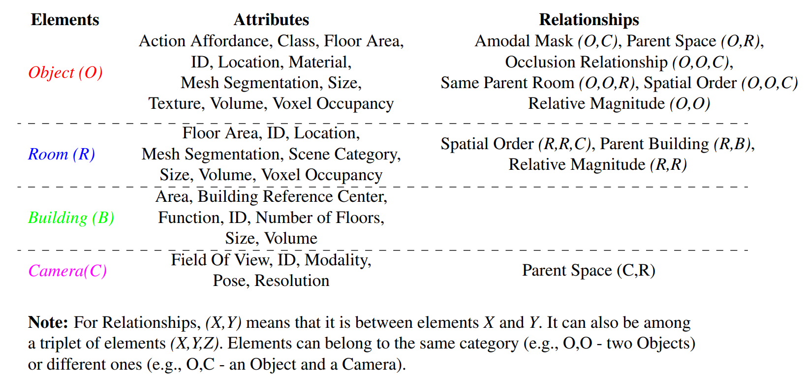 Relationships는 Edge에 저장되는 노드들간의 관계이다. 이때, (O,O,C)는 2개의 Object와 Camera로, Occlusion Relationship의 의미는 해당 카메라로 취득한 이미지 상에서 두 객체들이 포함되는지를 의미하는 관계이다. 또한, Same Parent Room은 두 객체가 동일한 Room에 있는지를 의미하는 관계이다. Relationships는 노드들의 정보들이 각 노드로 저장된다면 자동적으로 생성할 수 있다.