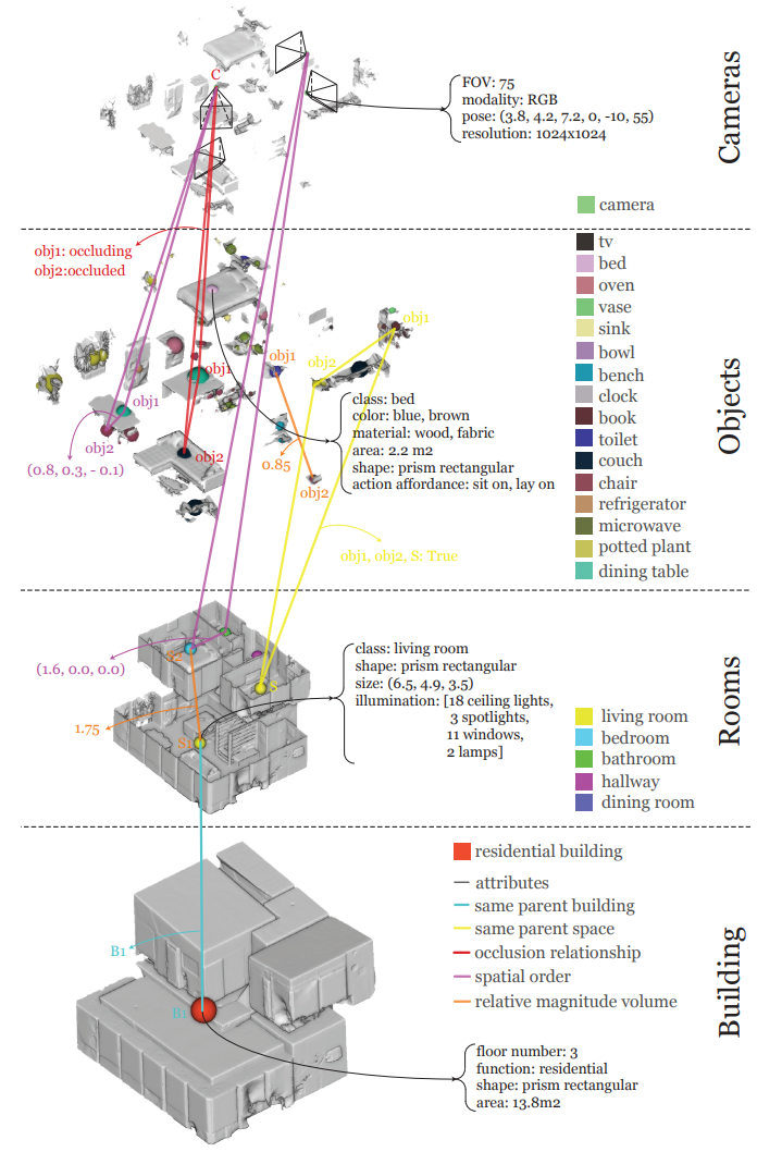 3D Scene Graph는 4계층(4 Layer) 그래프이며, 각 Layer는 노드(Node) 집합으로 구성, 각 노드는 속성(Attribute) 집합을 가지며, 노드간의 관계는 엣지(Edge)로 정의된다. First Layer는 전체 건물 즉, 주어진 3D mesho model을 의미하며, 이를 대표하는 root node를 포함한다. Second Layer는 건물을 구성하는 방으로 구성되며, 각 방은 고유한 노드로 표현된다. Third Layer는 각 방에 속하는 객체들로 구성되며, 각 객체는 고유한 노드로 표현된다. Fourth Layer는 카메라들의 집합이며, 각 카메라의 위치가 고유한 노드로 표현되고, 이는 각 위치에서 취득한 이미지와 연결된다.