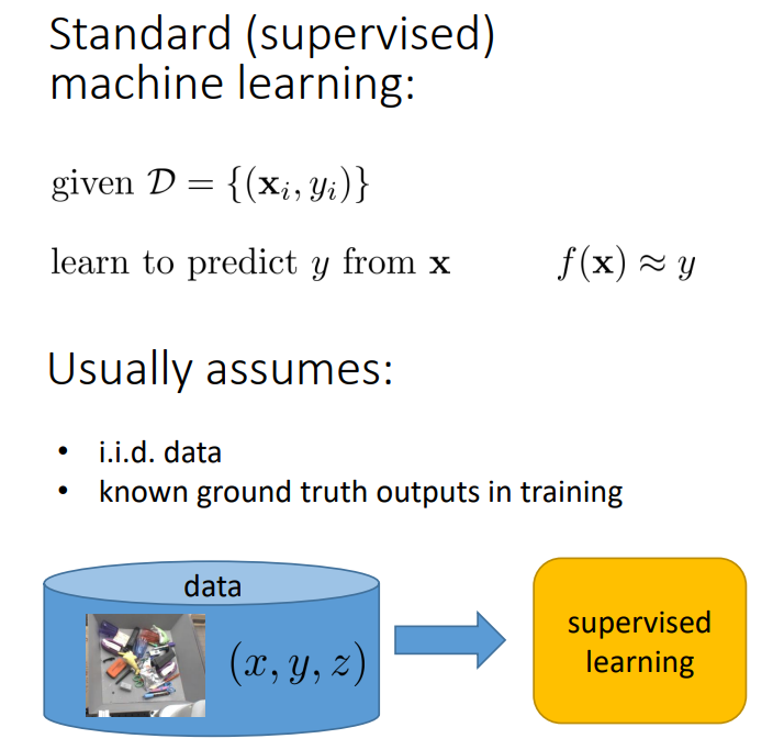 우리가 일반적으로 알고 있는 Standard(supervised) machine learning 즉, 지도학습은 입력 $x$와 출력 $y$로 구성된 데이터 $D$가 주어졌을 때, $x$로부터 $y$를 예측할 수 있다록 학습하는 것이다.