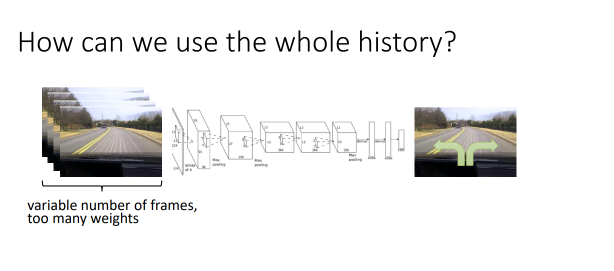 그렇다면, Policy가 과거 Observations를 고려해서 의사결정을 하도록 하려면 어떻게 해야할까? 아래와 같이 모든 장면 frames를 입력으로 넣어주면 되지만, weights 가 많아지는 단점이 있다.