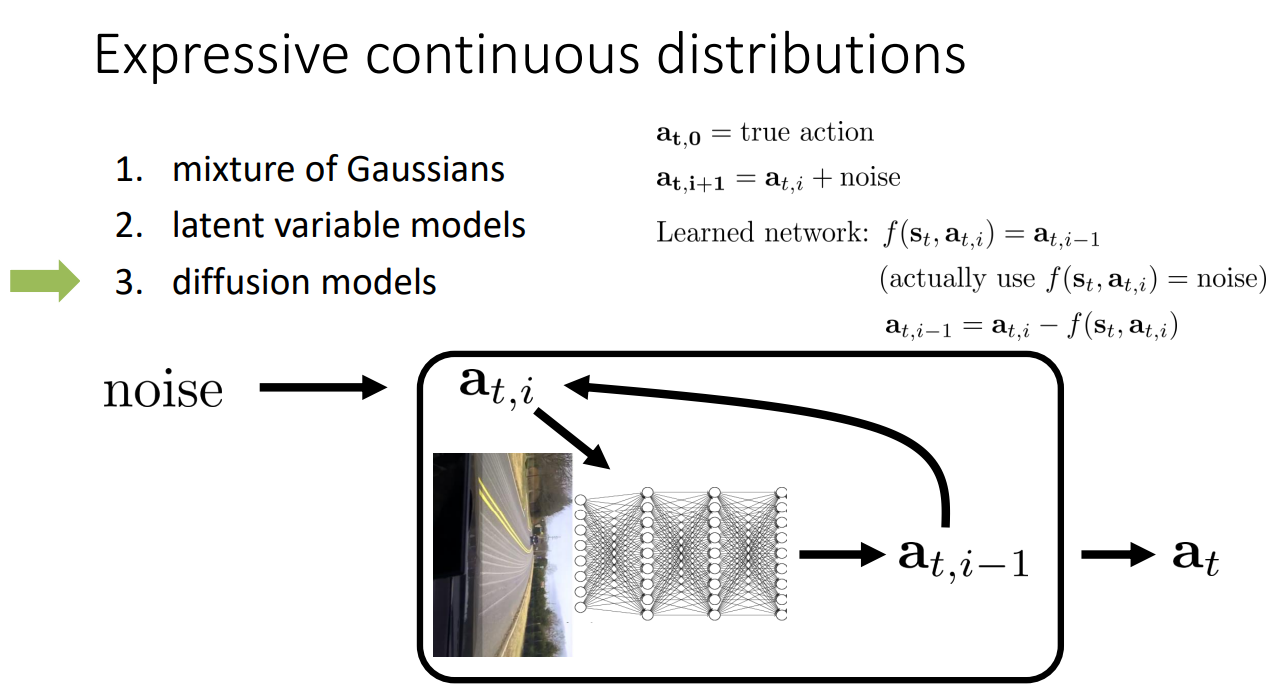 또 다른 방법은 Latent variable models를 이용하는 것이다. 이는 잠재변수(latent)를 이용해서 같은 관측에서도 서로 다른 행동 모드를 자연스럽게 생성하는 방법이다. 여러 행동들에 대해서 내가 유도하고자 하는 action이 유도되기 위해 잠재변수를 활용하는 방법이다.