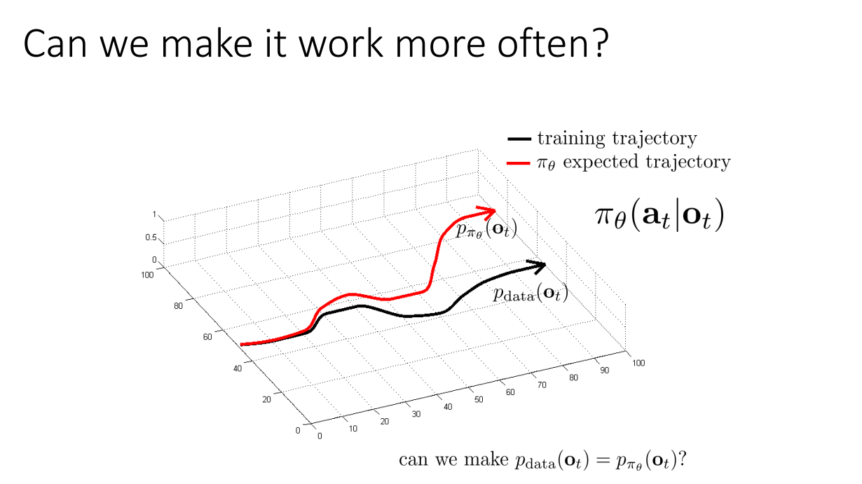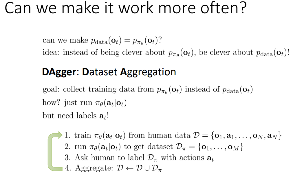 이전까지 문제가 되었던 state distribution shift를 해결하기 위해 $p_{data}(o_t) = p_{\pi_\theta}(o_t)$로 만들 순 없을까? 그렇다면 train/test 과정에서의 확률 분포가 동일해져 이전의 문제를 해결할 수도 있을 것이다.