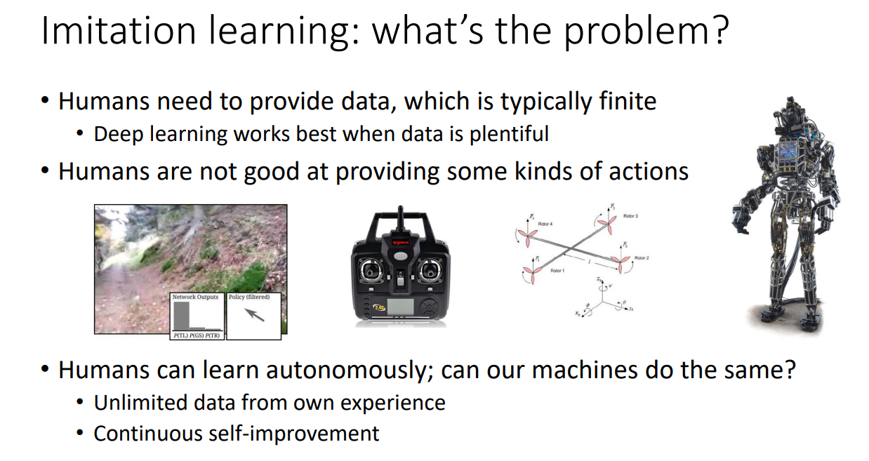 결국엔 모방학습이 완벽하게 잘 될려면 다양하고 많은 Data는 필수적이다. 그리고 이 Data는 사람이 제공해야되는데 이는 유한할 수 밖에 없다. 또한, 로봇이나 복잡한 기계처럼 다양한 DoF를 가지는 로봇 등에 적합한 행동을 사람이 완벽하게 구현할 수는 없다.