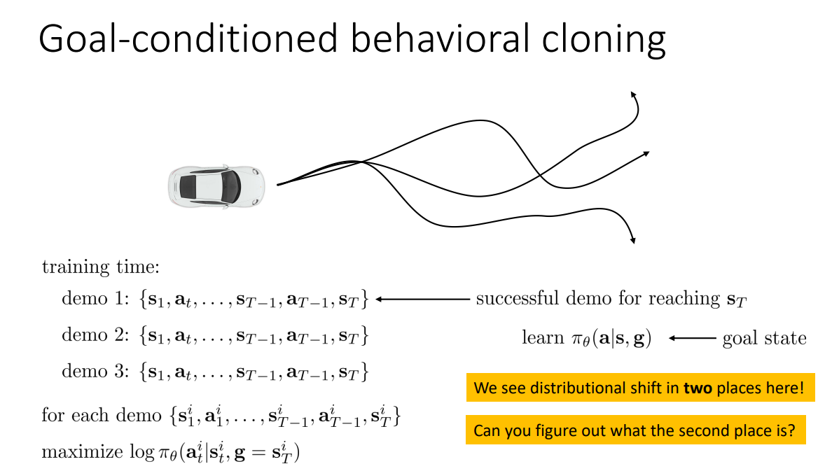 따라서 Goal-conditioned Behavioral Cloning은 기존 Behavioral Cloning의 고질적 문제인 state distribution shift를 해결한 algorithm이다. Training time에서 $s_T$에 성공적으로 도달한 여러 Trajectories에 대해서 각각의 $s_T$를 goal($g$)로 사용하게 되고, $log \pi_\theta(a^i_t|s^i_t, g=s^i_T)$를 maximize 하도록 학습하게 된다. 즉, 동일한 상태에서도 다른 goal을 가지면 다른 행동을 하기 때문에 다양한 상태를 cover할 수 있다.