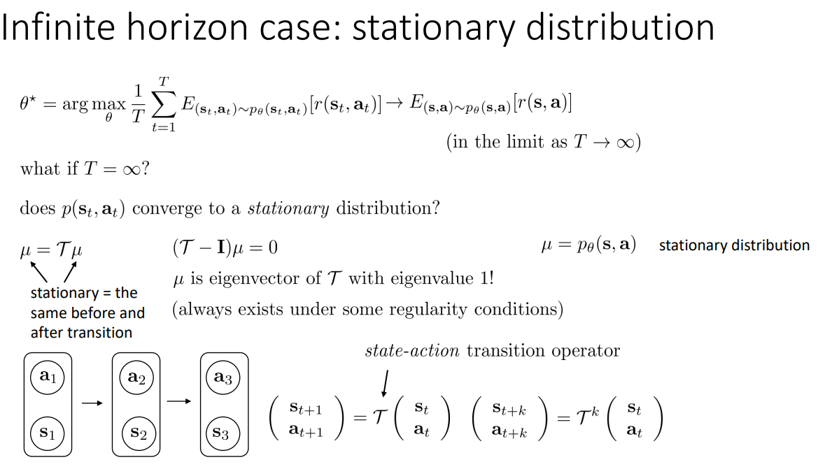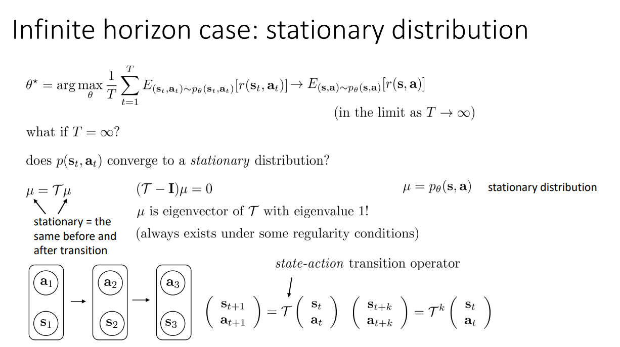 만약 $T$가 무한대라고 하면, Reward가 단순히 양수이면 무한대가 되어버려 수렴하지 않게 된다. 따라서 이런 경우 Stationary distribution을 가정하게 되는데, 이는 trainsition이 반복하게 진행되면 상태 분포가 더이상 변화되지 않고 유지됨을 의미한다. 따라서 $\mu = \mathcal{T} \mu$가 되고, 식을 변형하면 $(\mathcal{T}-\mathcal{I})\mu = 0$이 된다. 이는 선형대수적 관점에서 $\mu$는 eigen value가 1인 $\mathcal{T}$의 eigen vector임을 의미한다. 그리고 이러한 전개는 Ergodicitiy 즉, State는 어떠한 다른 State로도 0이 아닌 확률로 전이할 수 있음을 가정한 상태에서 유의미하다.