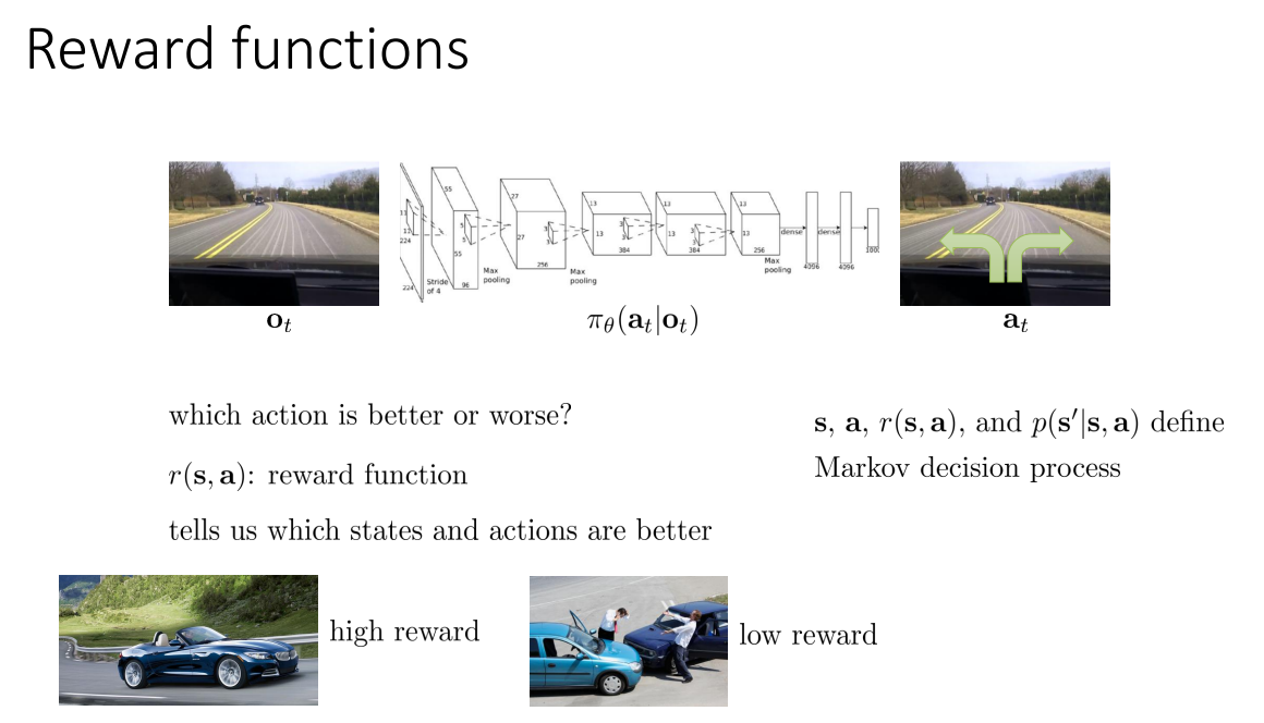 따라서 강화학습에서는 학습시킬 방향 즉, Policy가 달성해야 하는 목표를 정의해 주는 것이 필요한데, 이것이 바로 Reward functions(보상 함수)이다. $r(s, a)$로 표현되는 보상 함수는 어떠한 state, action이 더 좋은지를 의미하게 된다. 이때, 고민해야 할 점은 어떻게 나중에 더 좋은 보상을 가져올 행동을 지금 선택해야 할까? 이다.