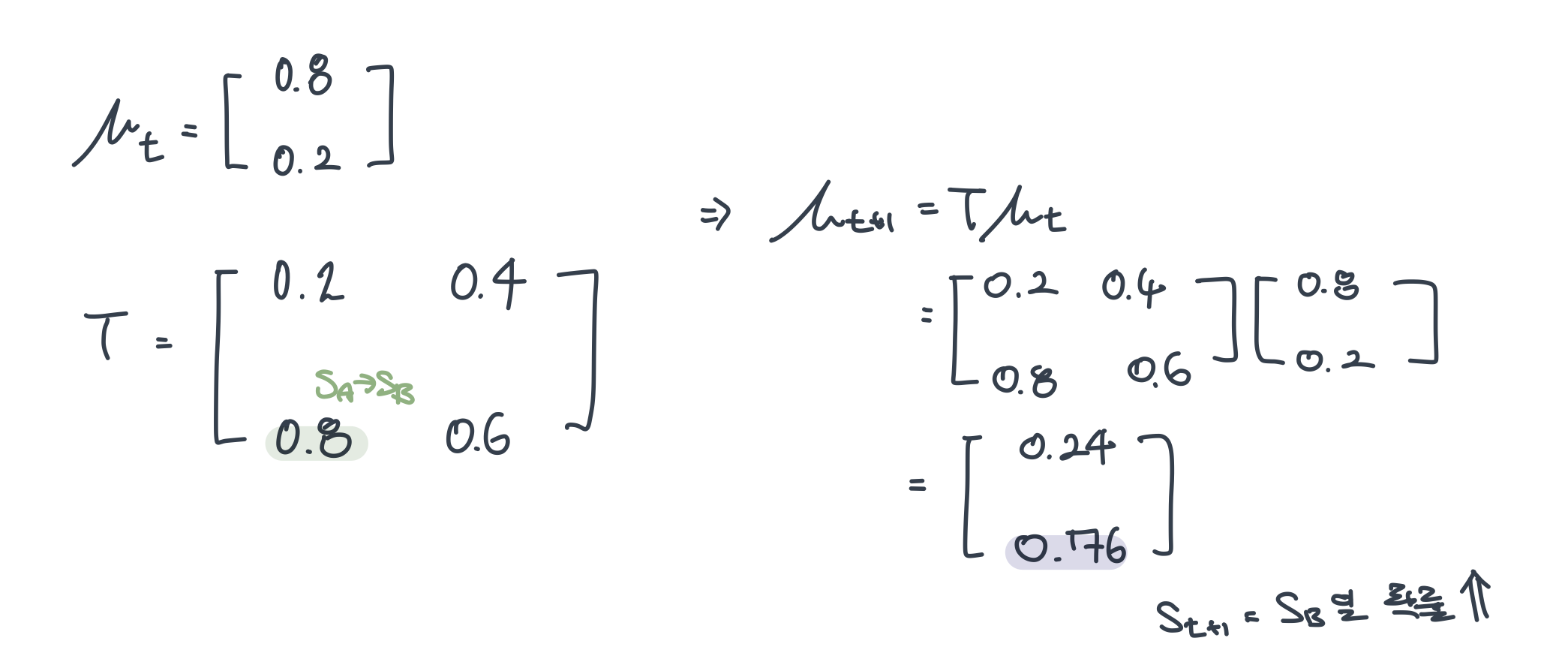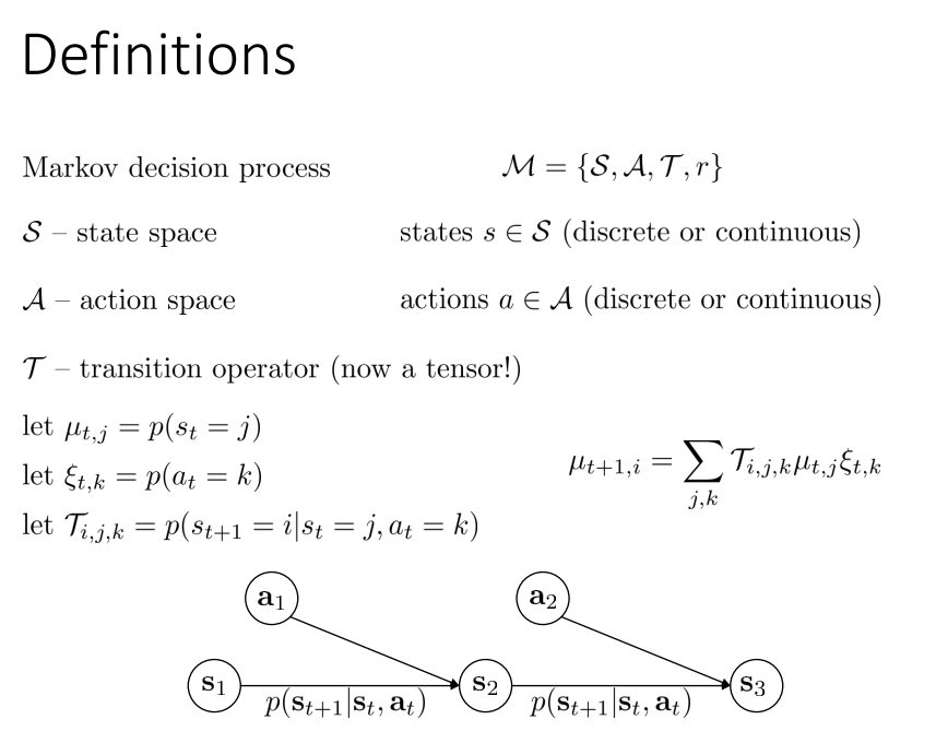 Markov chain은 Markov property를 만족하기 때문에, Transition operator $\mathcal{T}$는 $t$시점에서 $t+1$시점으로 State가 $s_t = j$에서 $s_{t+1}=i$로 이동하는 State transition operator(matrix)를 정의할 수 있다. 따라서 Markov chain $\mathcal{M}$은 State space $\mathcal{S}$, Transition operator $\mathcal{T}$로 구성된다. 이때, Transition operator가 operator인 이유는 $\mu_{t, i}$는 time $t$에서 state가 $i$에 있을 확률이므로 하나의 확률 벡터이고, $\mathcal{T}_{i,j}$는 $j$ state에서 $i$ state로 전이되는 확률로 구성된 Matrix이므로, $\vec{\mu_{t+1}} = \mathcal{T} \vec{\mu{t}}$는 상태를 전시키는 선형 변환의 operator로 동작하기 때문이다.