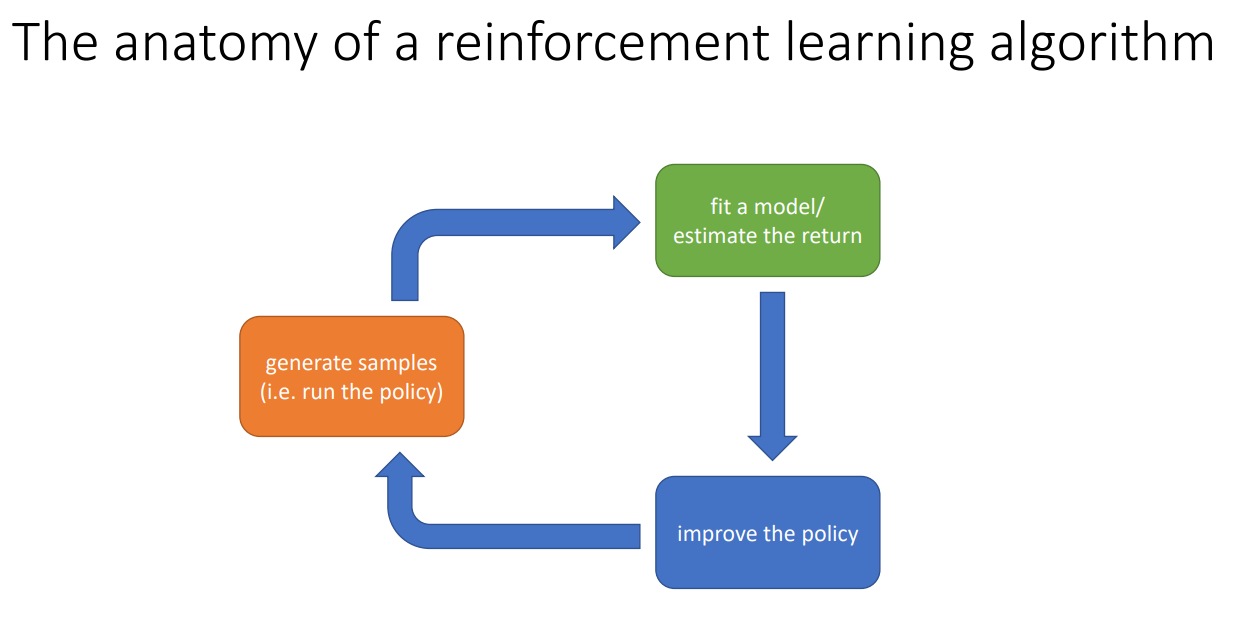 강화학습은 Trial and error를 통해 학습하기 때문에 Generate samples 단계에서는 먼저 Samples를 생성하기 위해 Environment와 상호작용한다. Fit a model/estimate the return 단계는 Policy를 강화하기 위해 Return을 계산하는 단계이다. 마지막으로 Improve the policy 단계는 Policy를 더 좋은 방향으로 향상시키는 단계이다.