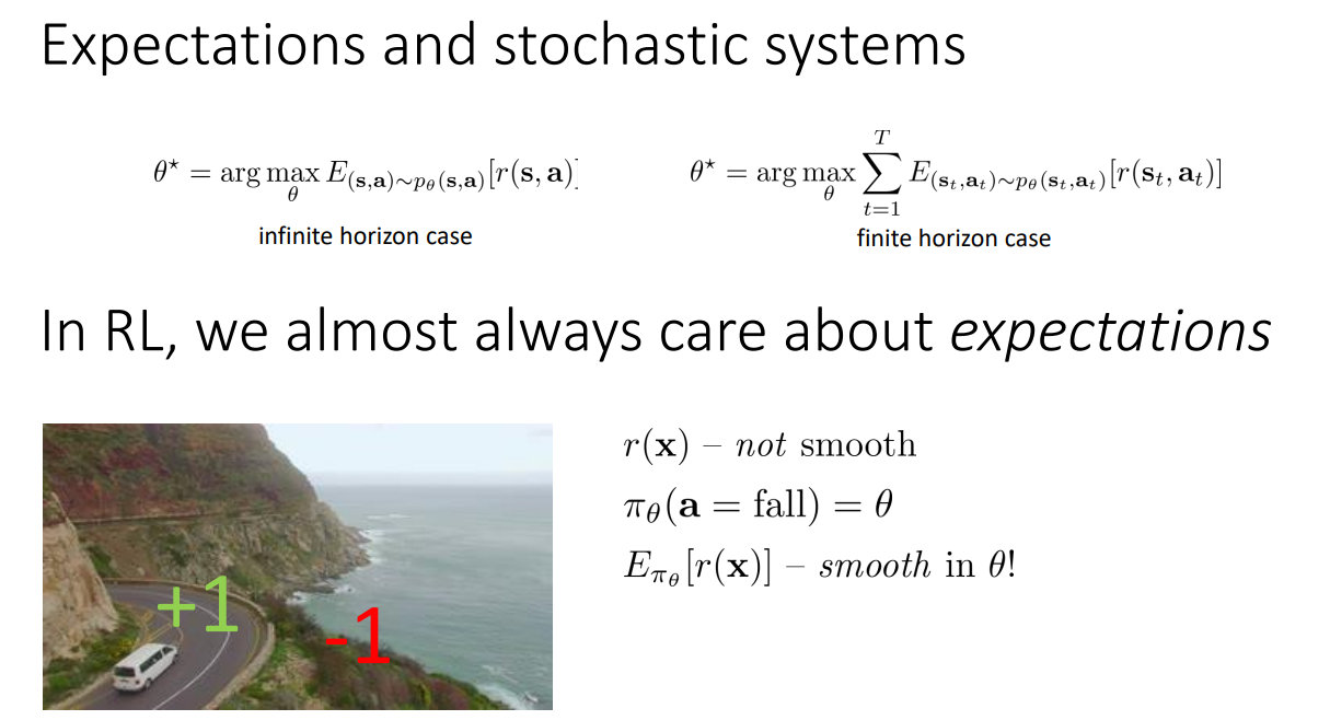 그렇다면 강화확습에서는 왜 Expectation(기댓값)을 활용할까? 아래 예시처럼 Reward function $r(x)$는 불연속적이고, Action은 $\pi$라는 확률에 의해 결정된다고 하자. 그렇다면 Reward는 불연속적이지만, Reward의 Expectation은 연속적이다. 따라서 이는 Policy gradient에 사용할 수 있기 때문에 Expectation을 활용하게 된다.
