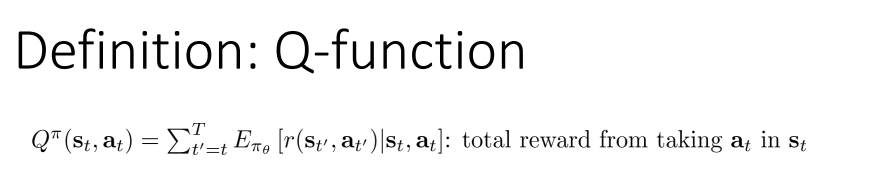 여기서 새로운 $Q$ function의 정의가 등장하는데, $Q(s_t, a_t)$은 time $t$의 $s_t$에서 $a_t$을 했을 때, 앞으로 받을 모든 reward의 기댓값을 의미한다.