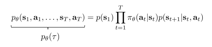 Markov property에 의해 일련의 Trajectory에 대한 Property는 아래와 같이 정의할 수 있다. State가 주어지면 Policy에 의해 Action이 선택되고, 그에 의한 전이 확률의 곱으로 정의됨을 확인할 수 있다.