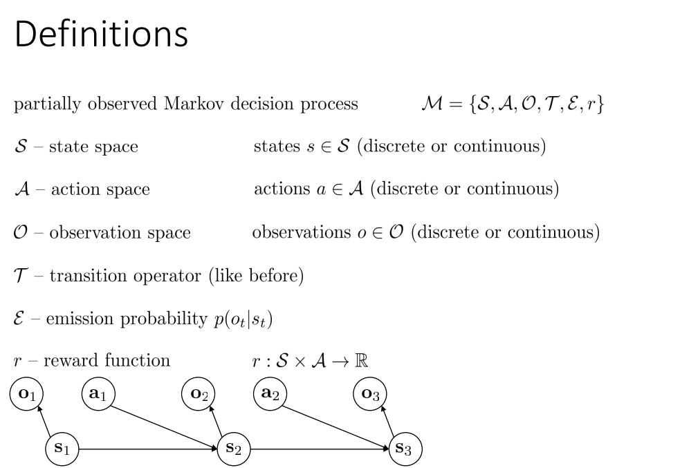 만약 완벽한 State가 아닌 Obesrvation을 가지는 경우 Partially observed MDP로 정의된다.