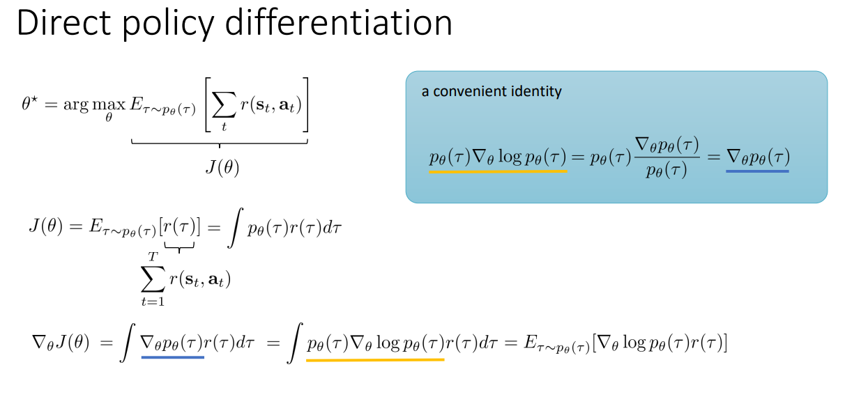 $$\nabla_\theta J(\theta) = \int \nabla_\theta p_\theta(\tau)r(\tau)d\tau$$
