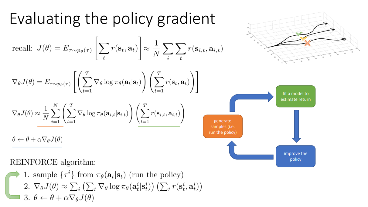 $$\nabla_\theta J(\theta) = E_{\tau \sim p_\theta(\tau)} \left [ \left ( \sum_{t=1}^{T} \nabla_\theta log \pi_\theta(a_t|s_t) \right )\left ( \sum_{t=1}^{T} r(s_t,a_t) \right ) \right ]$$