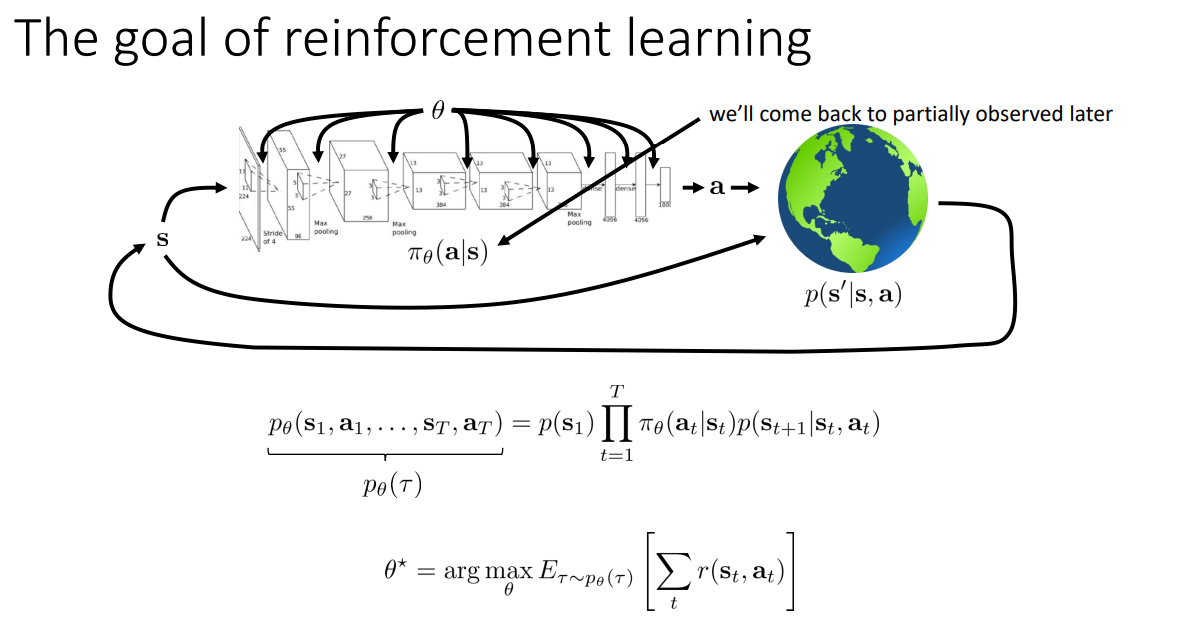 $$J(\theta) = E_{\tau \sim p_\theta(\tau)}\left [\sum_{t=1}^{T}r(s_t,a_t) \right ] = E_{\tau \sim p_\theta(\tau)} \left [ r(\tau) \right ]$$
