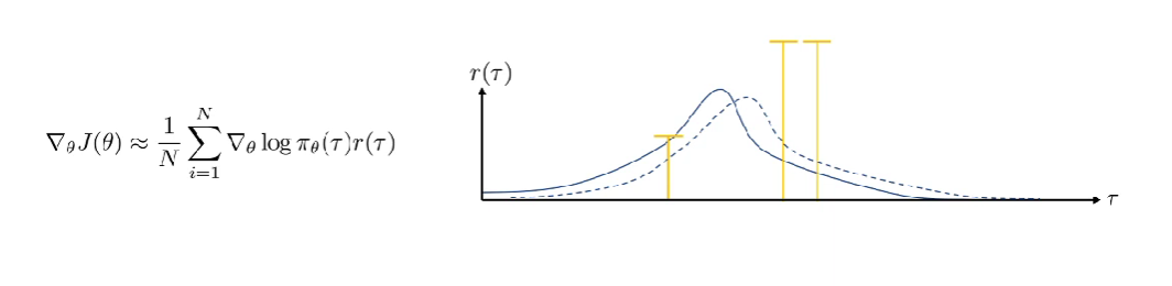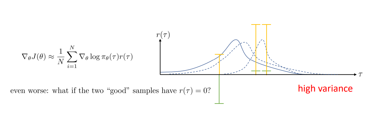 만약 오른쪽 두 양수의 Reward가 모두 0이라면? 왼쪽 Trajectory의 확률만 급격하게 줄이는 방향으로 변할 것이다. 이처럼 우리는 유한한 환경에서 Samples를 사용하기 때문에, 일정하지 못하고 High variance를 가지게 된다면 제데로된 학습을 할 수 없을 것이다.