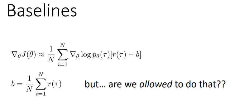 또 다른 방법은 Baseline을 활용하는 방법이다. 앞서 본 상황 중 Reward가 전부 양수인 경우도 있었다. 이처럼 단순히 Reward를 곱하는 것이 아닌 Reward에서 Baseline을 뺀 값을 곲해주는 방법인데, Policy gradients는 Rewards가 Centered일 때 동작하기 때문이다. 일반적으로 Baseline은 Reward의 평균을 활용한다.