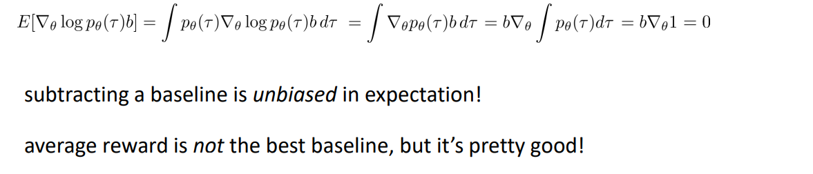 $$E_{\tau \sim p_\theta(\tau)} \left [ \nabla_\theta log p_\theta (\tau) \left (r(\tau) - b\right)\right]$$