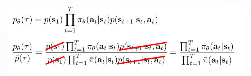 이때, 두 Distribution에 대한 식을 전개하면, 우리가 알고 있는 Policy probability의 곱만 남게 된다.