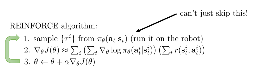 $$\nabla_\theta J(\theta) \approx \frac{1}{N}\sum_{i=1}^{N}\sum_{t=1}^{T} \nabla_\theta log \pi_\theta (a_{i,t}|s_{i,t}) \hat{Q}_{i,t}$$