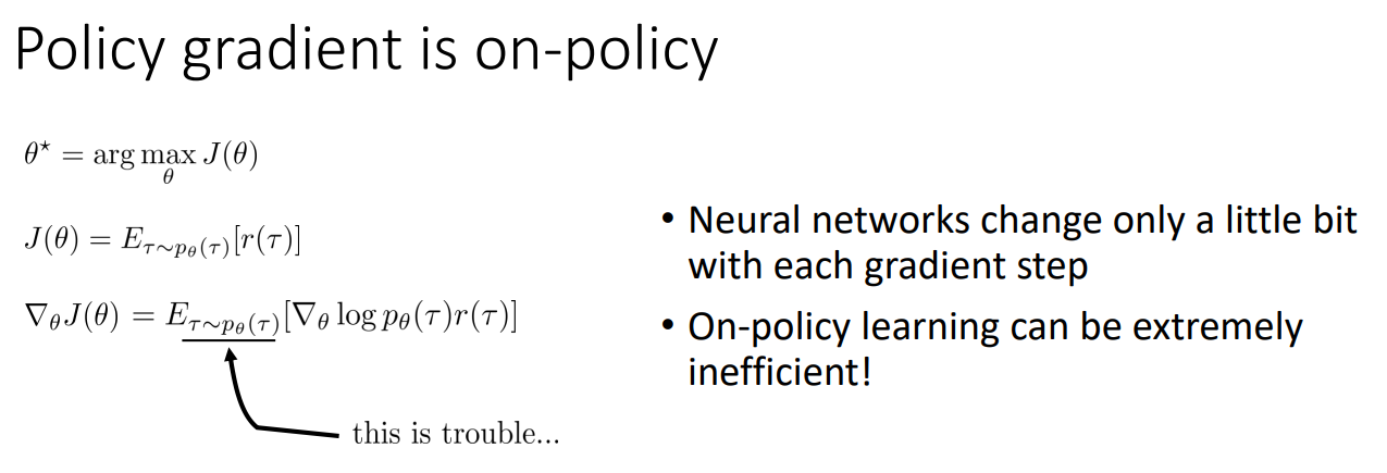 지금까지의 Policy gradient는 On-Policy 이다. 즉, $\tau \sim p_\theta(\tau)$의 경우 매번 Latest policy를 기반으로 Samples를 생성해야 하는 어려움이 있다. 특히, NN 기반의 DRL의 경우, 경사하강법의 기본 이론은 테일러 근사 이론이기에 Gradient step이 매우 작을 때만 성립하므로, On-Policy는 매우 비효율적이다.