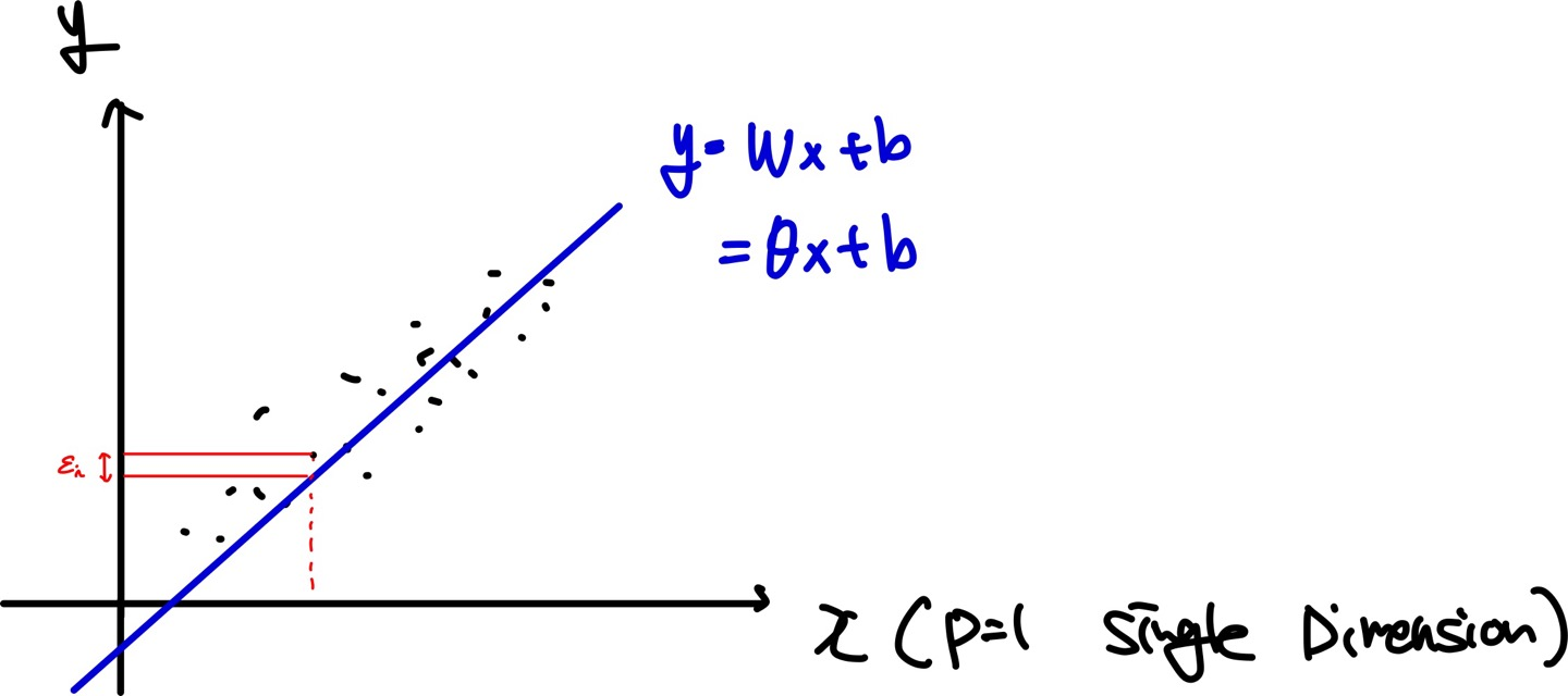 이때, $y_i$는 i번째 dependent variable, $x_{ij}$는 p dimension을 가지는 i번째 data, $\theta_j$는 parameter vector, $\varepsilon_i$는 i번째 error라고 가정하면 아래와 같이 표현할 수 있다. 이때, $\theta_0$는 bias parameter이다.