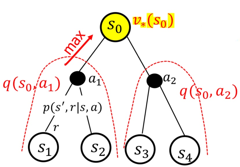 $$v_*(s) = \underset{a}{max} \sum_{s',r}^{}p(s',r|s,a)[r+\gamma v_*(s')]$$