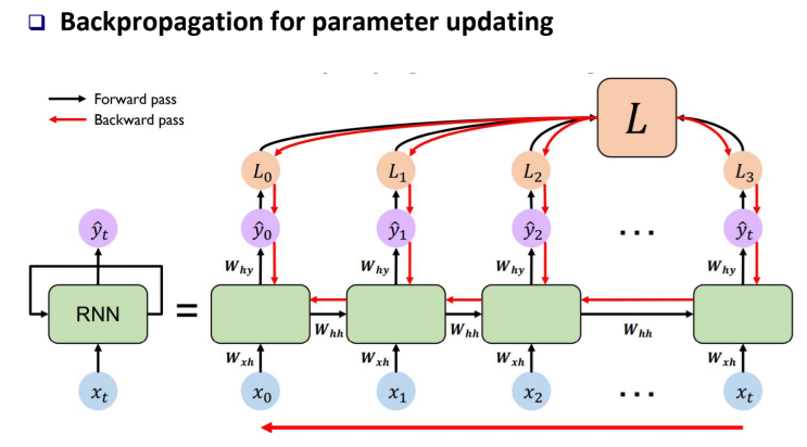 Weight를 update 하기 위해서 Backpropagation이 진행되는데, $W=W-\alpha\frac{\partial L}{\partial W}$ 경사 하강법을 이용하여 update를 진행한다. 하지만 RNN의 경우 Recurrent 되기 때문에 아래 빨간 화살표처럼 input length에 따라 역전파되 길이도 증가한다.