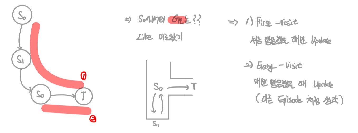 수많은 Episode에 대하여 위 경우를 살펴보자. $S_0,S_1$에서의 Return은 다음과 같이 계산된다.
