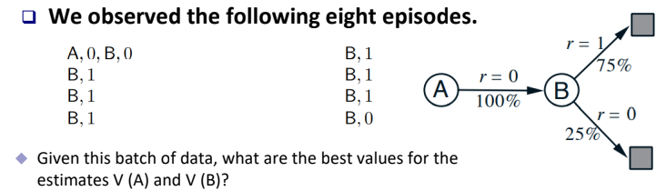 Episode가 위에 주어진 것처럼 8가지가 있다고 가정하고 그 순서는 왼쪽 위부터 오른쪽 아래로 흘러간다고 가정하자. MC 방식으로 계산하면 Episode의 순서에 상관없이 v(A) = 0이다. 하지만, TD의 경우 Episode의 순서가 거꾸로 흘러간다고 가정하면, $v(A) = v(A) + \alpha [0 + \gamma v(B) - v(A)]$로 계산되고, $\gamma = 1, v(A),v(B)$의 초기값이 0이라 가정한다면, v(A) = 0.75로 계산된다.