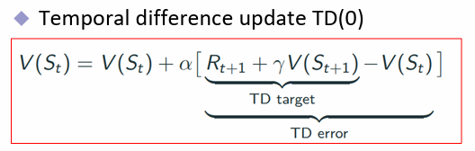 $$v_{k+1} \leftarrow v_k(S) + \alpha [R_{t+1} + \gamma v_k(S') - v_k(S)]$$