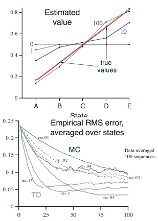 그래프를 보면 TD가 true values에 더 가까움을 알 수 있으며, RMS error역시 TD가 더 빠른 속도로 줄어들기에 더 빠른 속도로 정답에 수렴함을 알 수 있다.