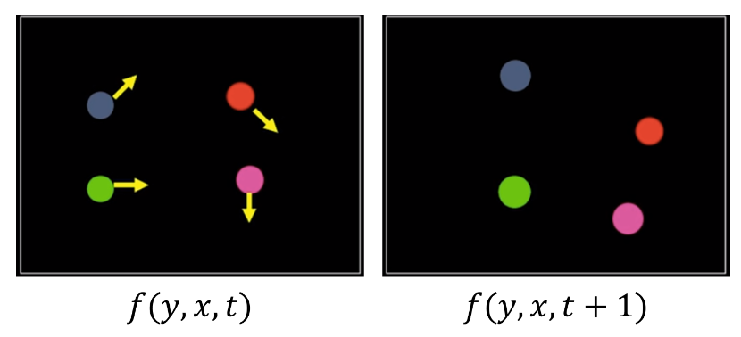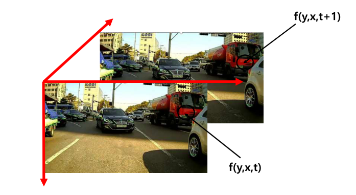 이때 $I(x,y,t) -> I(x,y,t+1)$로 인하여 $f(y,x,t) -> f(y,x,t+1)$가 발생했다고 이해하면 쉽다.