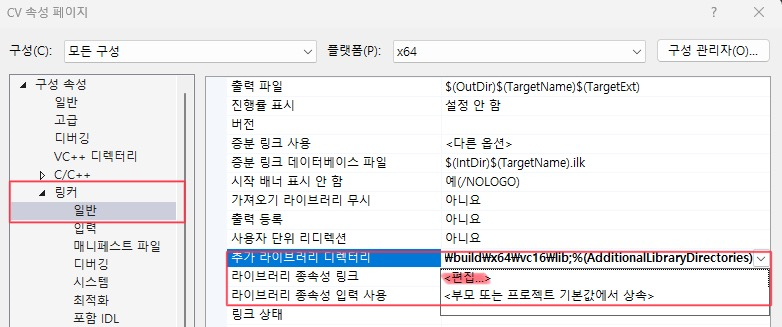각자의 opencv\build\x64\vc15\lib 경로 설정