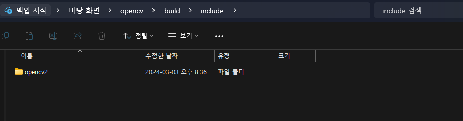 만약에 해당 경로를 못찾겠다면 바탕화면에 생성한 opencv 폴더에 직접 들어가서 bin\include 까지 경로 찾아서 들어간 후