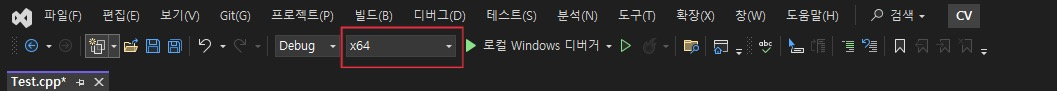 x64를 기반으로 작업 하기에, Visual Studio 상단 툴바에서 x64로 설정한다.
