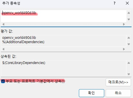 현재 OpenCV Version이 4.9.0이므로 opencv_world490d.lib 입력