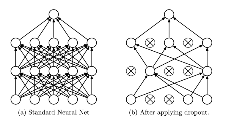 다양한 모델의 예측을 결합하는 앙상블 기법을 사용하기에는 큰 네트워크 구조에서 진행하기에 비용적으로 비효율적이다. 따라서 Dropout 기법을 활용했는데, 이는 사용자가 지정한 확률을 근거로 특정 뉴런에 신호를 전달하지 않는 방법으로, 모델의 복잡성을 감소시킬 수 있다. 저자는 50%의 확률로 설정하여 dropout된 뉴런은 feed-forward에서 제외되기에 back-propagation에서도 제외된다. 따라서 학습시 Dropout을 적용시켜 Overfitting을 방지하고 네트워크의 일반화되도록 하였다.