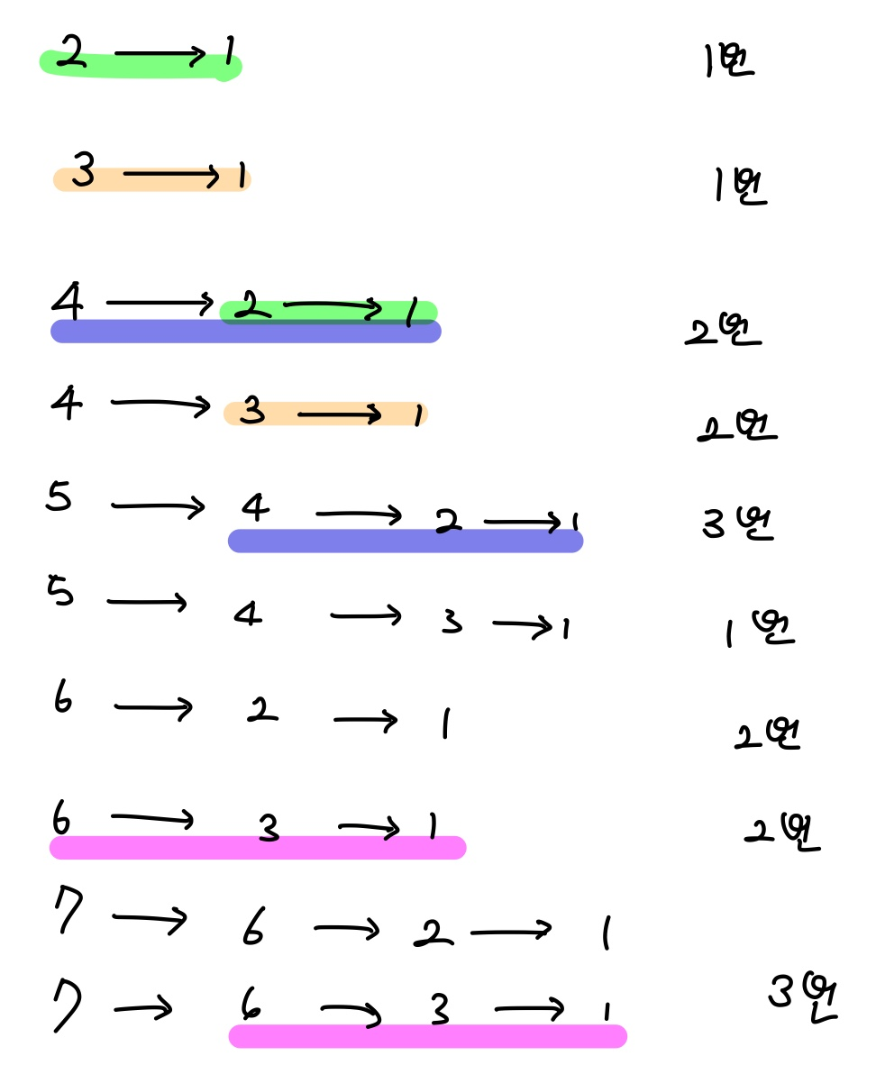 6은 2와 3으로 모두 나누어 떨어진다. 2로 나누면 3이고, 3은 1번의 연산으로 1로 만들 수 있다.